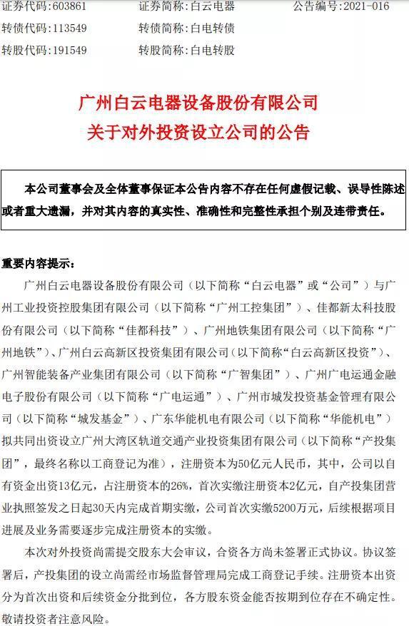 4月13日,白云电器、佳都科技均发布公告,白云电器、广州工控集团、佳都科技、广州地铁、白云高新区投资、广智集团、广电运通、城发基金、华能机电拟共同出资设立广州大湾区轨道交通产业投资集团有限公司(简称“产投集团”,最终名称以工商登记为准),注册资本为50亿元人民币。