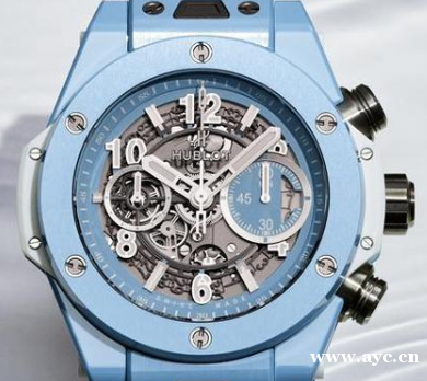 宇舶Big Bang Unico天空蓝陶瓷腕表。直径45mm陶瓷表壳/时间指示、日期窗、飞返计时码表/MHUB1242 UNICO飞返计时机芯,动力储存72小时/蓝宝石水晶镜面、透明底盖/防水100米/限量100只