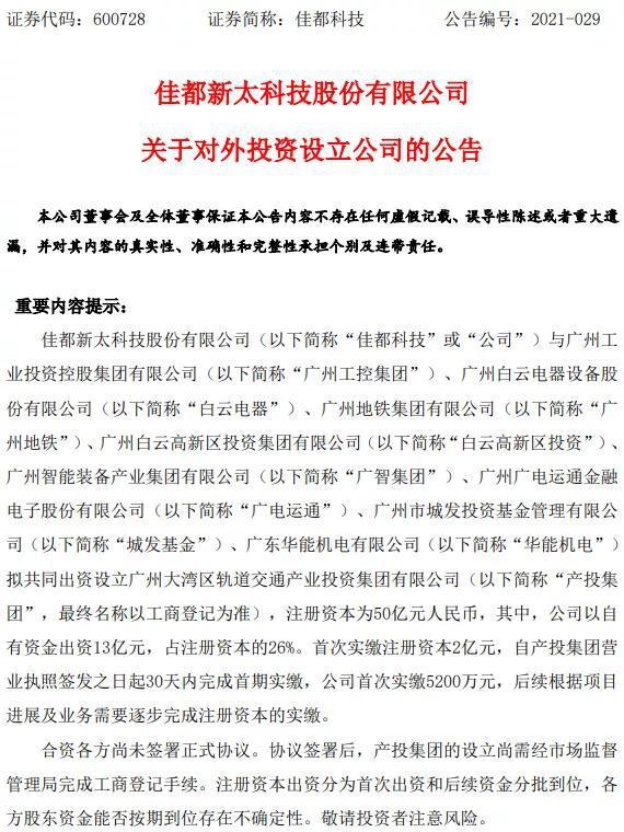 4月13日,白云电器、佳都科技均发布公告,白云电器、广州工控集团、佳都科技、广州地铁、白云高新区投资、广智集团、广电运通、城发基金、华能机电拟共同出资设立广州大湾区轨道交通产业投资集团有限公司(简称“产投集团”,最终名称以工商登记为准),注册资本为50亿元人民币。