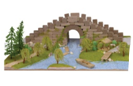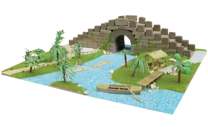 "比例1:30,主体材料环保陶土,底板尺寸为300x240mm,含多种形状的砖块,创意石桥类建筑模型,制作重点在于通过绿化带、河流的制作体现江南水乡的意境。