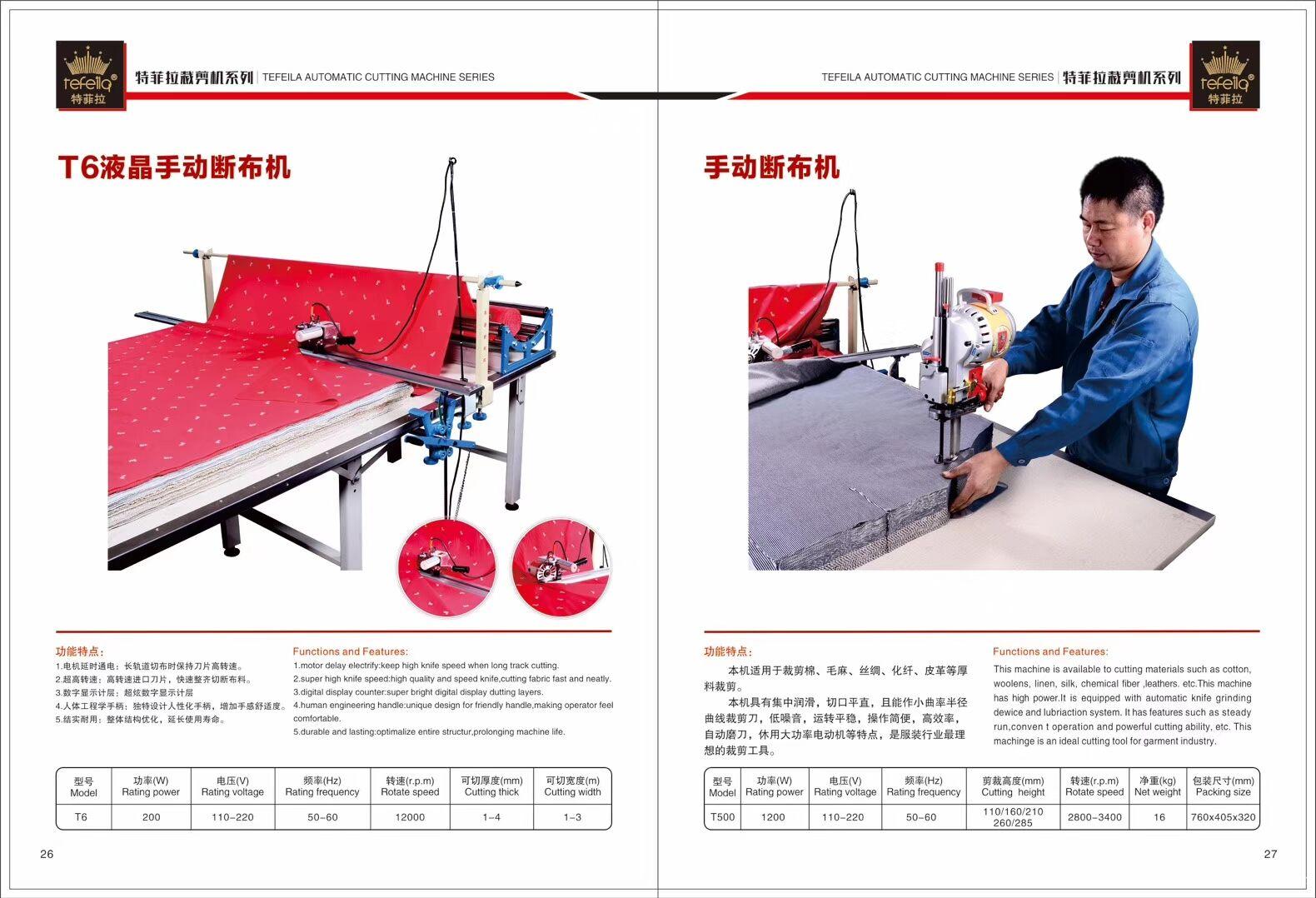 本机有短柄及长柄两种机型,具有切割快,平齐及准确,无论厚薄布料均能切割自如。本机省时,省力,省材料,单向自动磨刀,自动记数,显示功能,切割宽度有920mm-2400mm(可选2.8米及3.0米轨道)。
