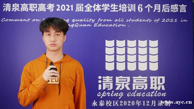 “一万年太久,只争朝夕”。我对每一堂课,每一次听写,每一次作业,都认认真真地对待。为的就是给自己打造坚固的装备和锋利的武器,在清泉高职高考辅导班这里,让自己能够在高考的战场上脱颖而出,考到自己理想的学校。临近考试,每一个人都不约而同地紧张起来,这段时间的冲刺阶段里, 我们不仅比的是谁更加地刻苦,而是比谁能够保持好心态和状态;一步一步地跟随老师们的复习安排,结合自己的时间合理分配,稳步向前,打赢高考这场人生战役。