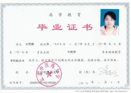 学生在规定学习期限内修满教学计划规定的全部学分,专升本学生在读期间必须参加教育部组织的公共基础课的全国统一考试,成绩合格者,可颁发经教育部电子注册、国家承认学历的北京中医药大学专科、本科毕业证书(加注“网络教育”)。