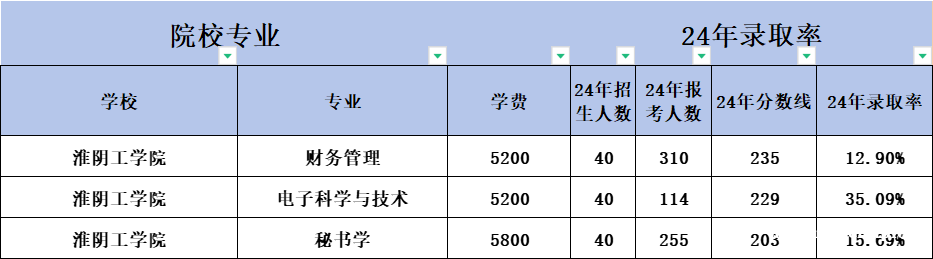 2024年五年一贯制专转本招生计划里,淮阴工学院一共计划招生120人(不含退役大学生士兵批次),录取专业分别是:财务管理、电子科学与技术、秘书学。24年分数线以及录取率如下: