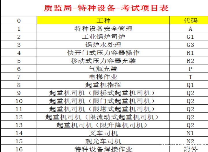 3、质监局特种设备作业:P气瓶充装作业、N1叉车、Q1起重指挥、Q2桥式起重、Q2门式起重、Q2流动式起重、Q2缆索式起重、T电梯维修、R2压力容器、N2观光车、G1工业锅炉等。